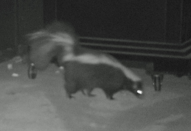 Works great too! I'll report more about the unit in action next time. Seems like deer season has crept up on us again. Our early whitetail rifle season opens this Saturday the 16th. We have seen no mature bucks so far this year, and in spite of reports of fewer whitetails in Eastern Washington, we are as overrun as ever with does and young of the year. Washington Department of Fish and Wildlife is reporting that an outbreak of Bluetongue and Epizootic Hemorrhagic Disease has taken a toll on deer populations in Northwestern Idaho and Eastern Washington. Thus, there are restrictions on taking antlerless deer in our area. For example, us old farts (65 and over) are allowed only bucks this year for both seasons in our area. Speaking of wildlife, we are still blessed(?) with an overabundance of wild turkeys in most of the state. They are not only a nuisance here in the country, they have taken over many neighborhoods in the cities. The problem is exacerbated by the 'do-gooders' who insist that they not be harmed and even feed the damn things to keep them around. All I can conclude is they must like turkey poop on their patios a lot better than we do! The poop issue brings up another matter. A few days ago Little Heifer noticed a small pile of poop in the corner of the under-deck patio. We were unable to identify the species. Wasn't turkey, didn't look like cat, coyote, or raccoon, so we were puzzled? Setting up a game camera secured to a chair solved the mystery. We have had this visitor now 3 nights in a row. ![]() Here's Mr. or Ms. Skunk
