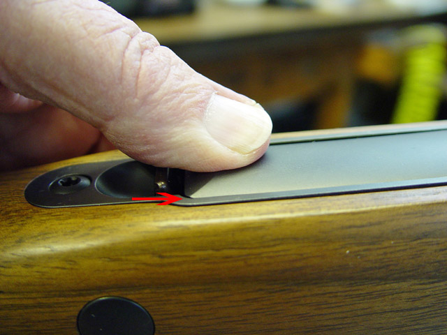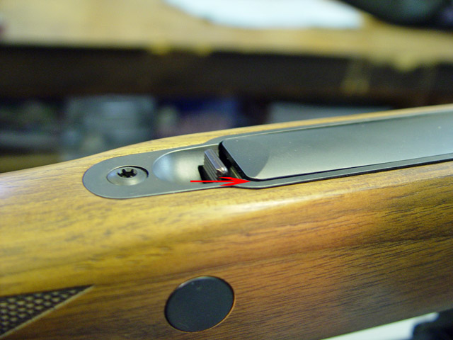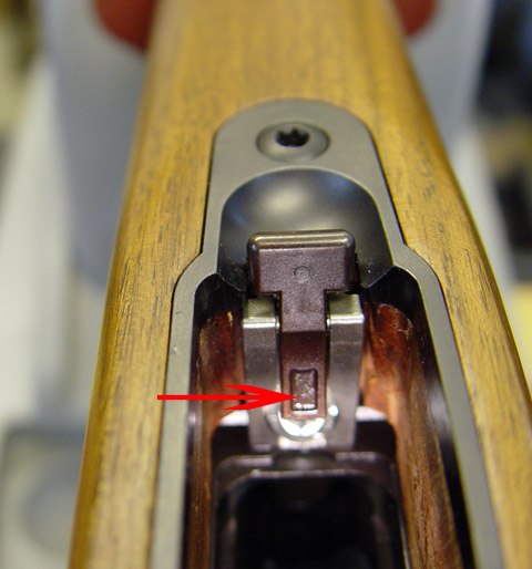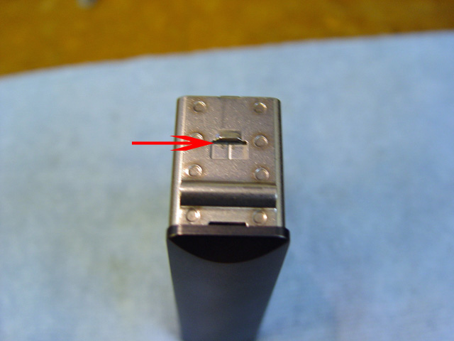 Magazine housing with arrow pointing to the end of the release tab that locks the magazine in place.