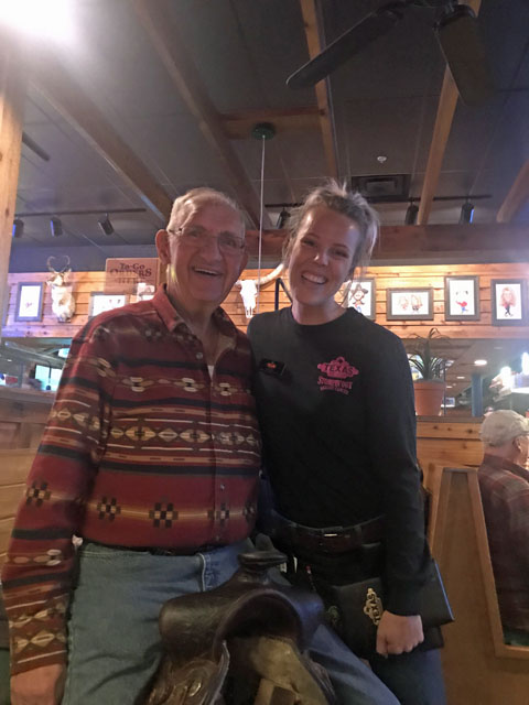 (Ain't all that good) The local Rotary Club has maintained a booth for many years selling locally grown 'sweet corn on a stick.' The ear of corn is dipped into a crockpot of melted butter and handed to you in a cardboard tray dripping with goodness! Ann doesn't eat corn and I must cut it off the cob in order to eat it, but man, is it good! We were also suprised at the lack of livestock. There were no beef cattle, hogs, sheep, or dairy cattle. Other than goats, rabbits, and chickens there was very little livestock in evidence. Our visit was about midway into the Fair's 10 day run, so we don't know if the stock had come and gone, or were slated to come in later in the week. The biggest letdown however, was the lack of pork tenderloin sandwiches! The vendor who has had those tenderloins for many years, was not there! To add insult to injury, another vendor who was listed in the Fair Program as having pork tenderloins on their menu, actually didn't have them! Had we not gotten in free, we would have asked for our money back! I mentioned two birthdays earlier. Well mine was first. On 'the day' September 20th, Ann and I ventured to Texas Road House in Coeur d'Alene, Idaho for my birthday supper. As usual, my entree choice was 'Roadkill.' This tasty dish is nothing more than a large hamburger steak with the Roadhouse's special seasonings. Delicious! Birthdays at the Roadhouse always include a dessert and an opportunity for a 'ride' on the celebration saddle and this was no exception. Our waitress was very nice as well. ![]() Anticipating that good Texas Roadhouse food!