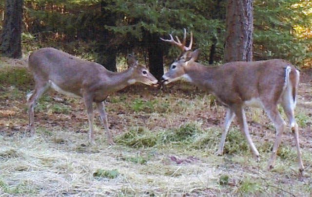 All three of these rifles are capable of much better groups than those shown, but on that day I wasn't. I continue to blame the Epirentinal Membrane in my left eye for lack of visual clairity though the scopes, but I aint that good a shot anymore either. All these targets show 'minute of deer angle' though. Another way to look at it is, none of the shots are more than two inches from point of aim, so we were good to go. Whitetail Deer seasons here in Game Management Unit #124, began October 13th and ended October 26th. The so called 'Late Buck Season' runs November 10th through 19th. Because of the overabundance of deer in this area, 350 second deer tags were available for GMU 124. Ann, Rick, and I all applied and were all drawn for these antlerless tags. As a side note, being old farts, Little Heifer and I could legally take antlerless animals during both seasons. Saving our doe harvest until late in the season in order to keep the 'girls' around to attract mature bucks, resulted in only one buck kill during early season. This guy had been hanging around here for several weeks, so could have been taken about any time. Rick decided to wait until the last day of the early season. For those 'tree huggers and animal rights activits' who want to 'humanize' or pretend that animals, wild or not, have the ability to 'reason or plan' like people, I offer the following trail camera shot: ![]() Here they are kissing and planning the amorous liaison they are anticipating for estrous and rut.