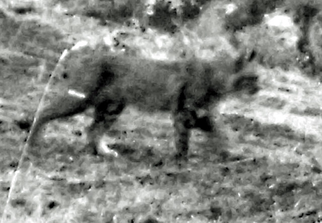 After getting the buck to the shop building via tractor bucket, Ann and I left for dinner at the Elks Lodge, leaving Rick to do the gutting and skinning. (I would pay for that later) I mentioned the trail camera picture above, and need to elaborate on that a bit. We put out three trail cams well before the season opens to see what is around the ranch in the way of wildlife both day and night. One is an older model Moultrie that uses regular flash in low light and at night. The other two are another Moultrie and a Browning, both of which switch to infrared images when light fades. All three accept ordinary SD cards to store their images and the cards were changed out every one to three days. The emphasis is of course, on mature bucks when looking at the pictures, but we get a lot more pictures of does and fawns than anything else. Also we occasionally get things that surprise us. This year the surprises included a coyote, a skunk, and a bobcat with a half-grown kitten. Unfortunately, me and my trigger happy mouse finger managed to delete those original pictures when culling trail cam photos to save space. It happens that all those photos were in infrared mode, so they weren't all that clear anyway. I did manage to salvage a cropped and enhanced image of the grown cat which I will put on here. (Obviously, my elementary Photoshop software ain't professional grade) ![]() Bobcat on trail cam, she was followed by a half grown kitten