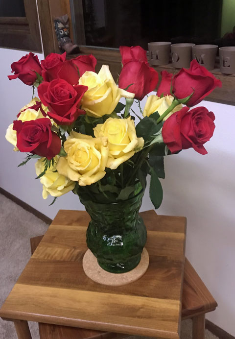 We keep hoping to get a picture of a cougar, but that has not happened for us. We know they are here because Ann sighted one crossing the County road here in the neighborhood several months ago. October 30th marked Ann's Birthday. I have permission to publish her age but will only say she is 40 days younger that I. To avoid other conflicts we started Ann's celebration a little early on October 29th. First was the bouquet of roses I delivered that morning. Little Heifer's favorite rose color is yellow, but I also added a dozen reds to balance things out. ![]() Birthday Roses for the Birthday Girl